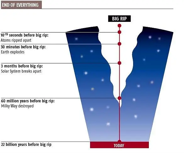 According to this theory, the rate of expansion will keep increasing as dark energy becomes stronger. In due course of time, the forces holding the universe together are overcome by the strength of dark matter, and eventually, all galaxies, solar systems, stars, and every other object, are pulled apart.